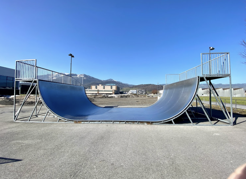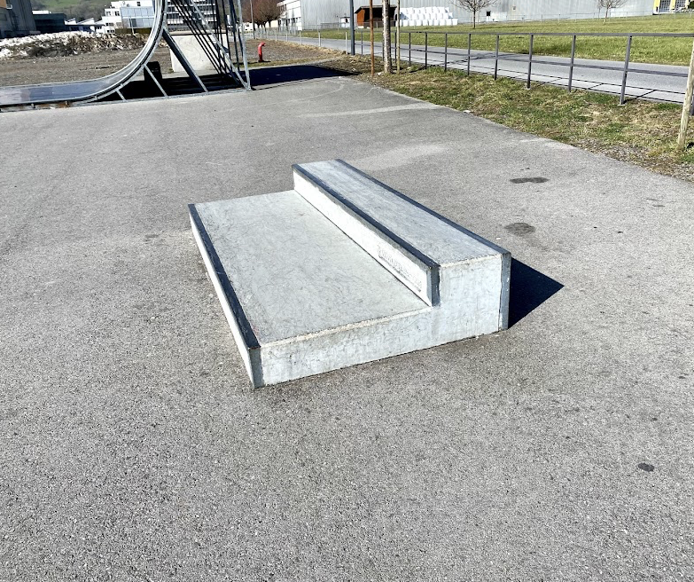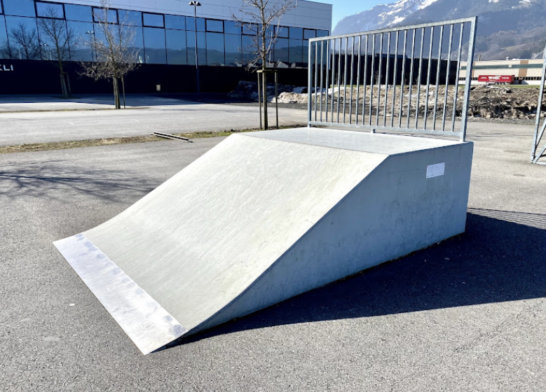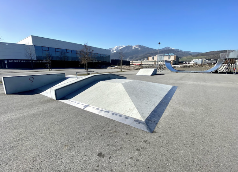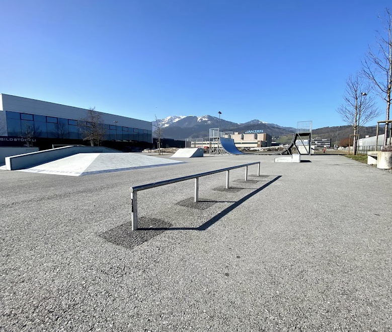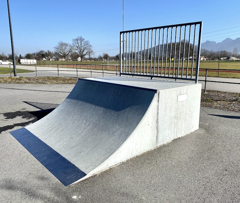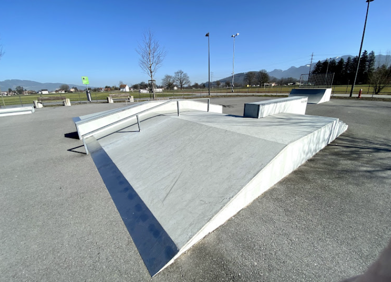 Oberriet skatepark features a miniramp and several basic skateboarding obstacles.