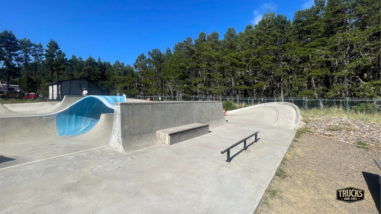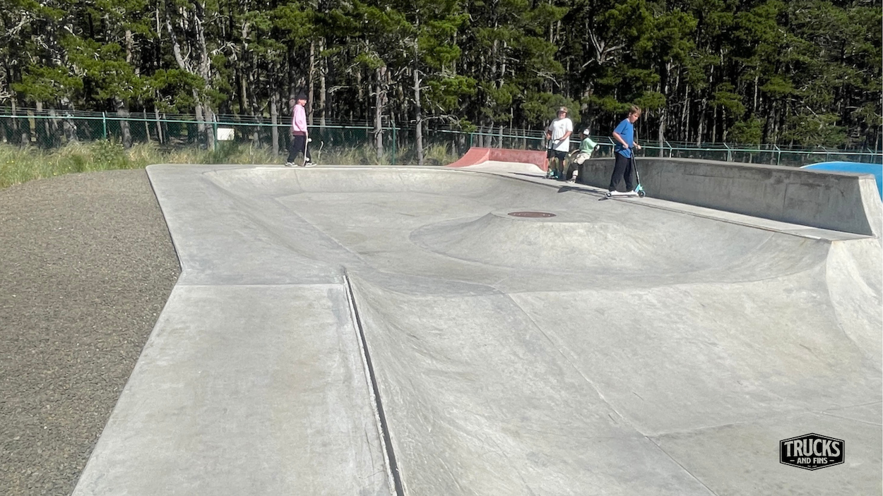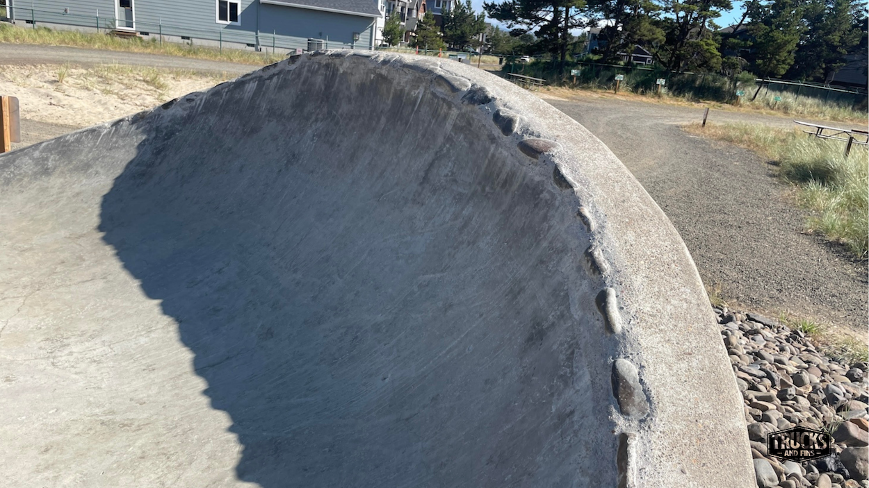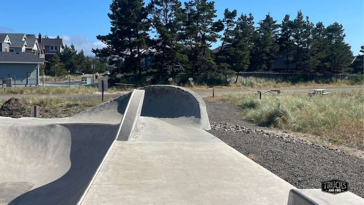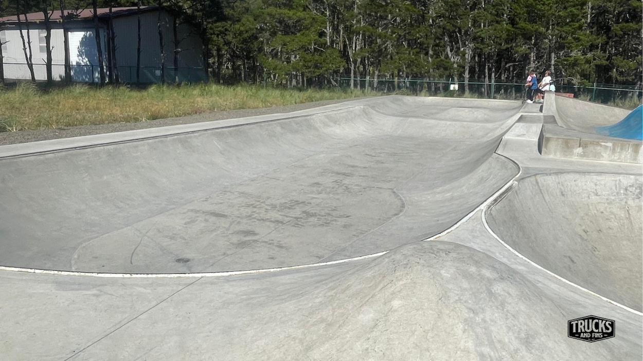 Pacific City Skatepark features a concrete bowl with cradle. The skatepark was built by Dreamland skateparks.