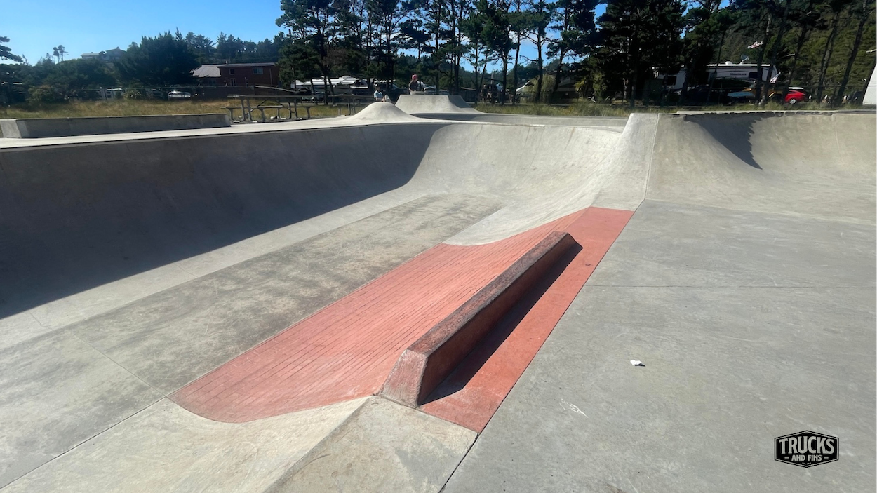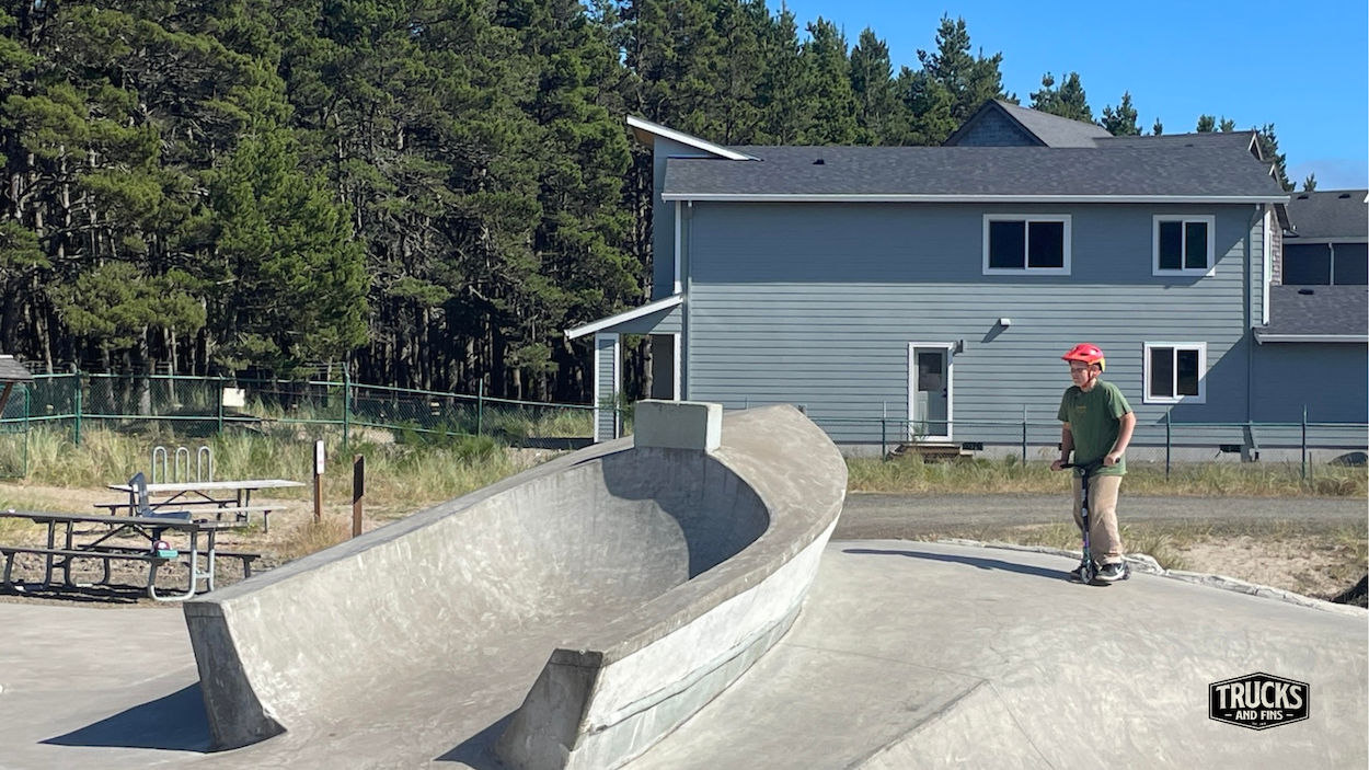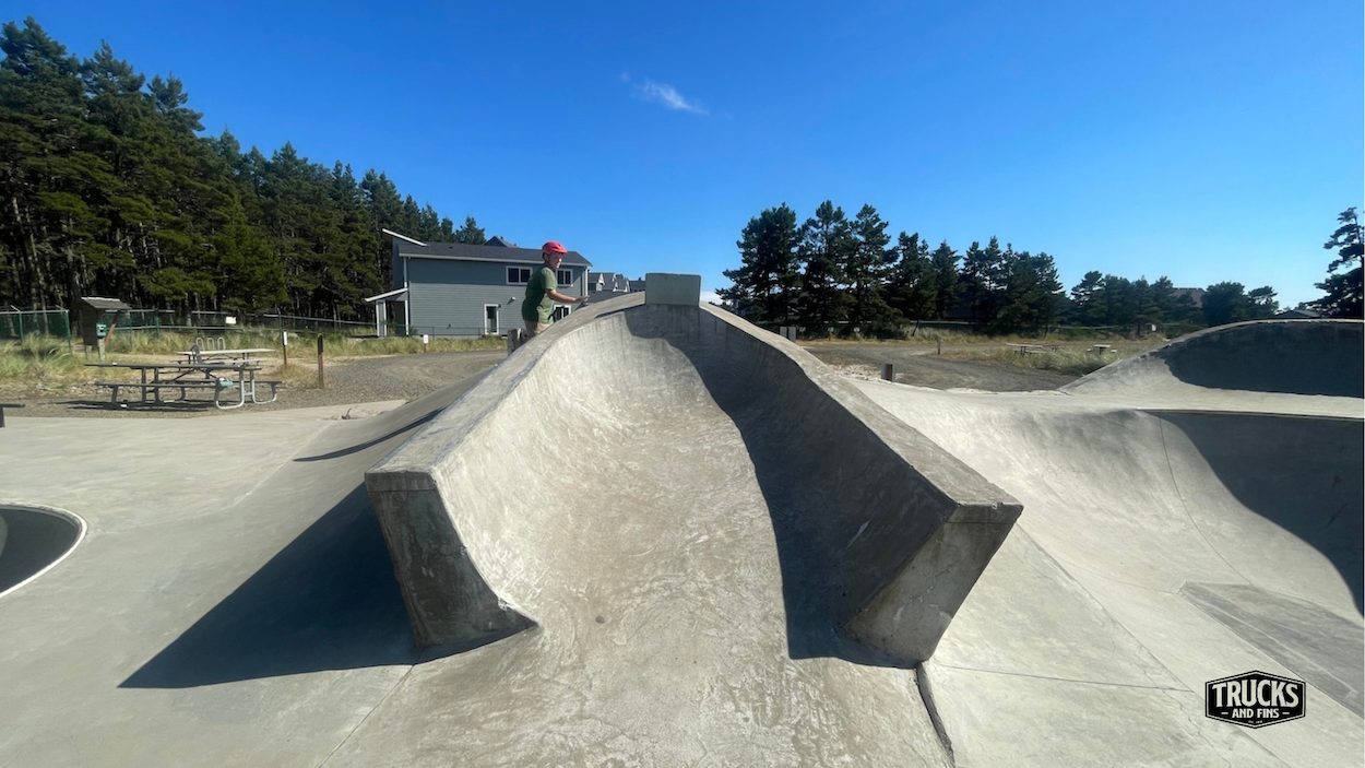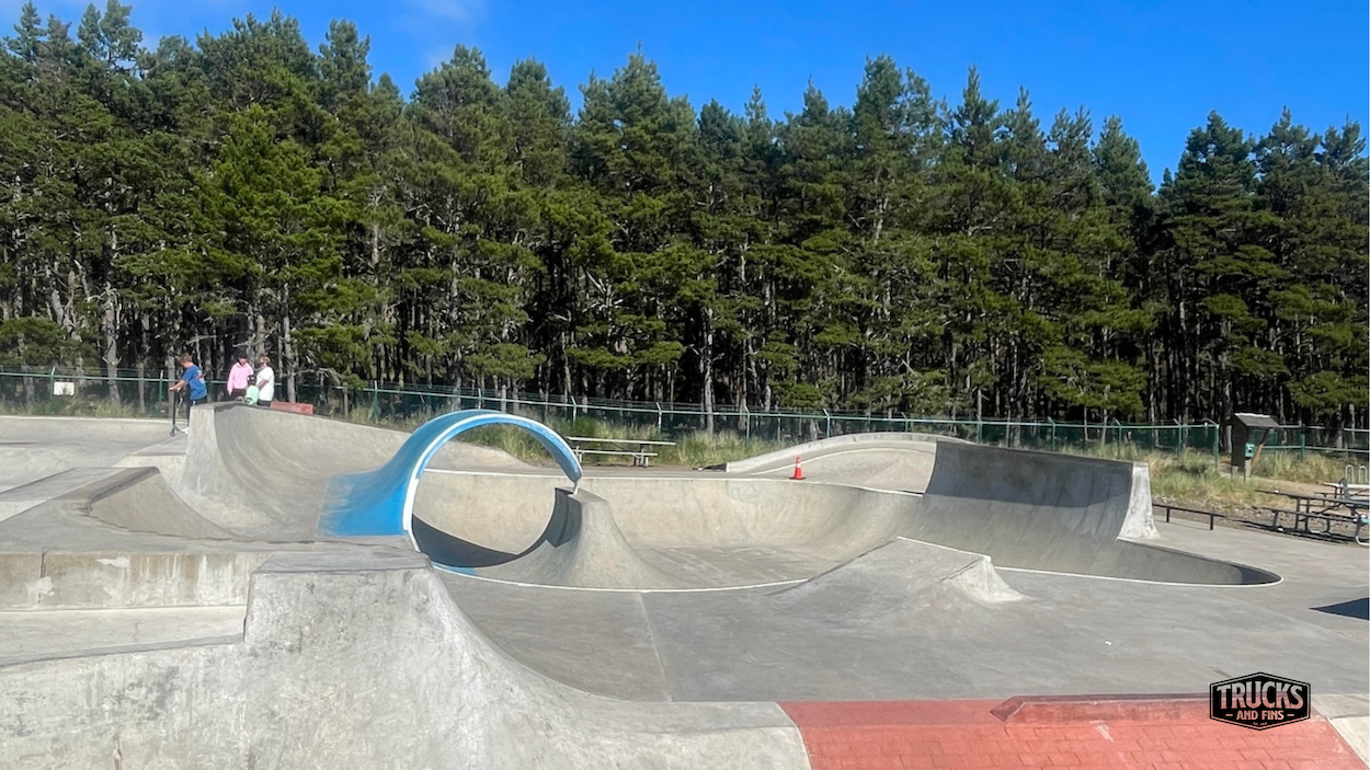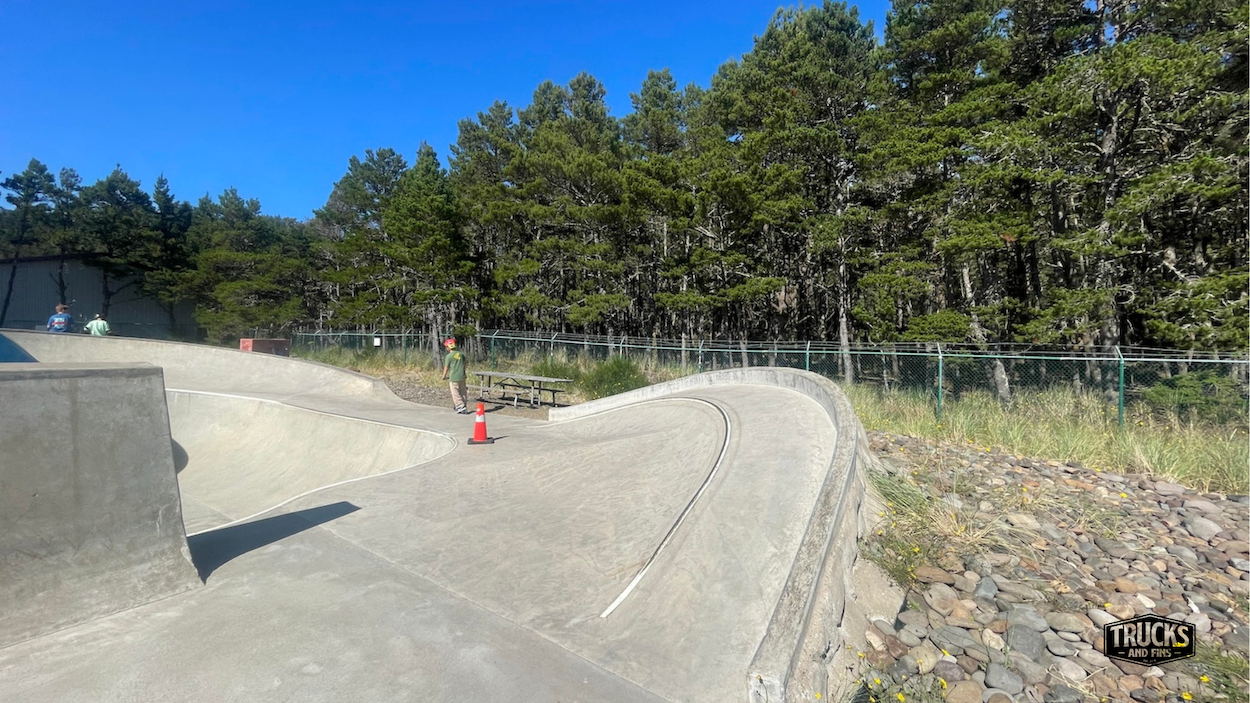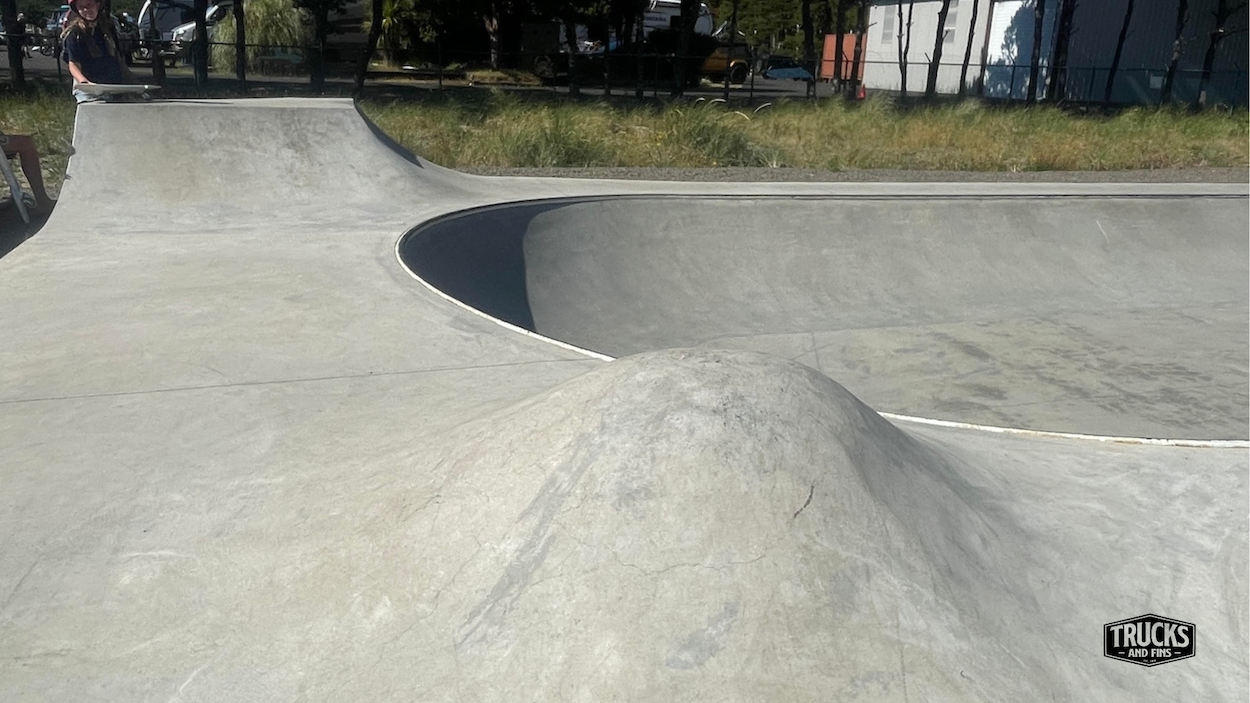 Pacific City Skatepark features a concrete bowl with cradle. The skatepark was built by Dreamland skateparks.
