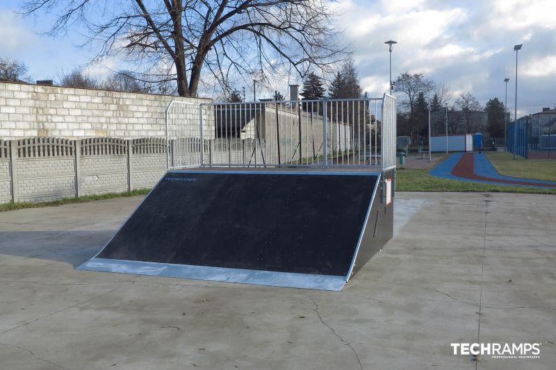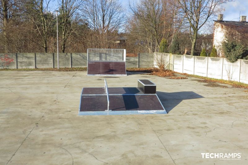 Poraj skatepark is a small park with a miniramp and several basic obstacles in a back and forth setup. The skatepark was built by Techramps.