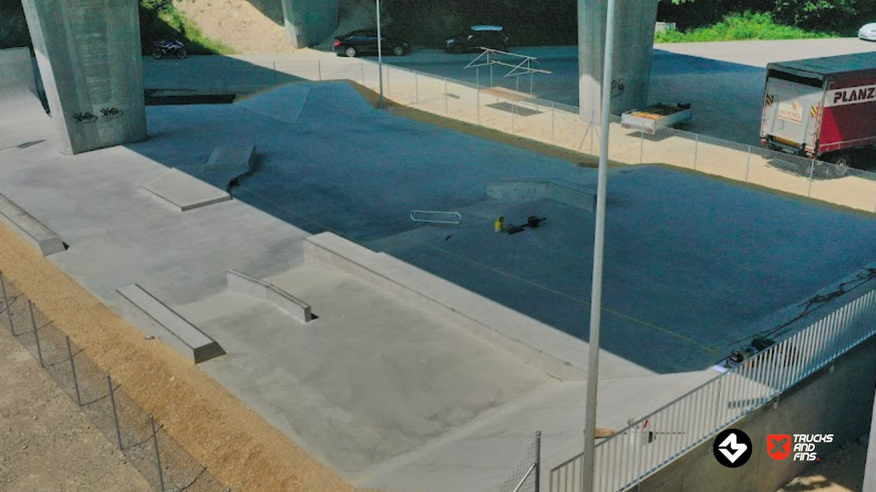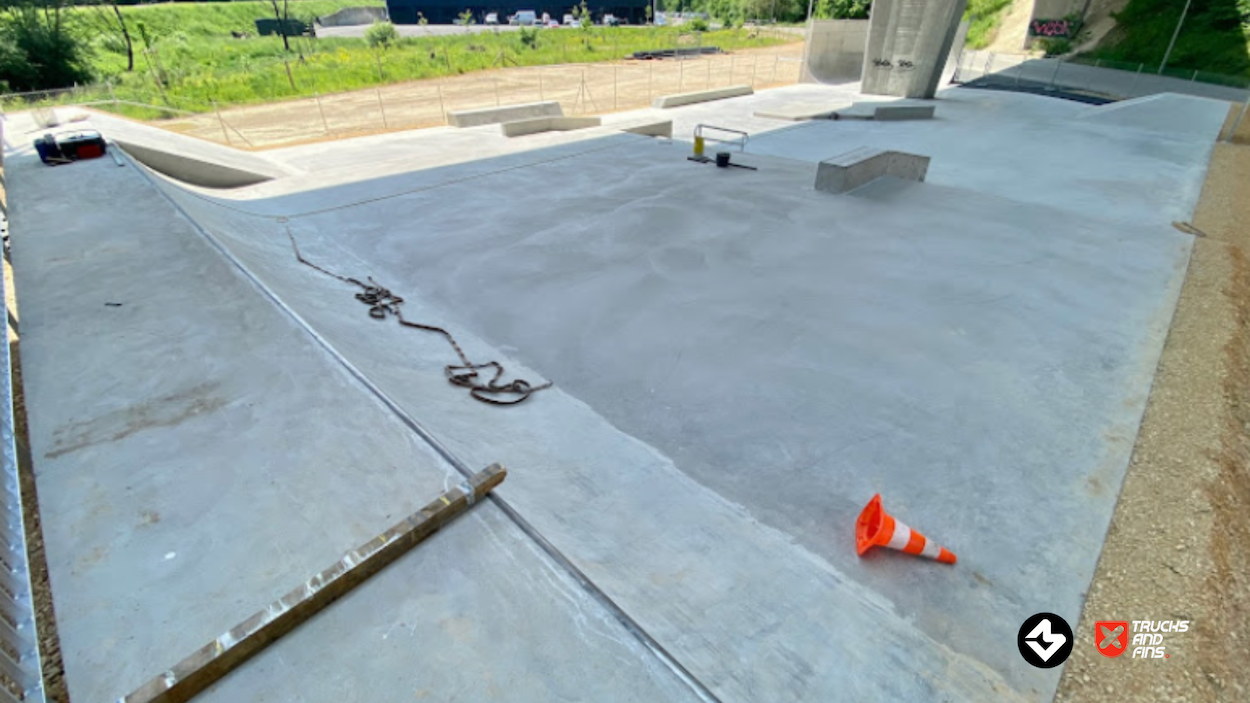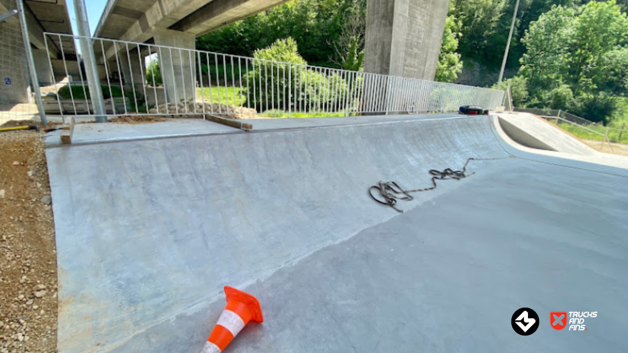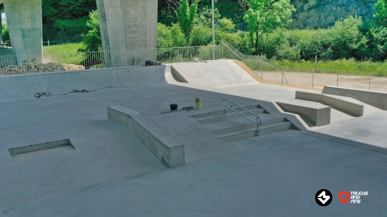 The Porrentruy Skatepark, inaugurated on May 27, 2023, is located under the A16 bridge in the Voyeboeuf industrial zone of Porrentruy, Switzerland. This strategic placement not only provides shelter from adverse weather but also minimizes noise disturbance to nearby residents.