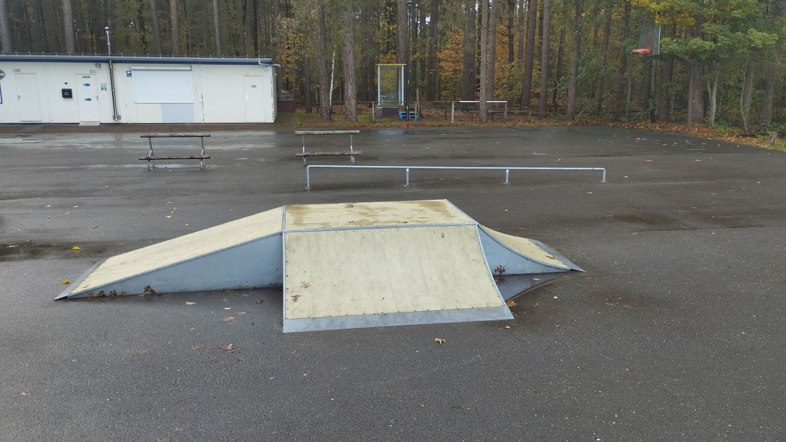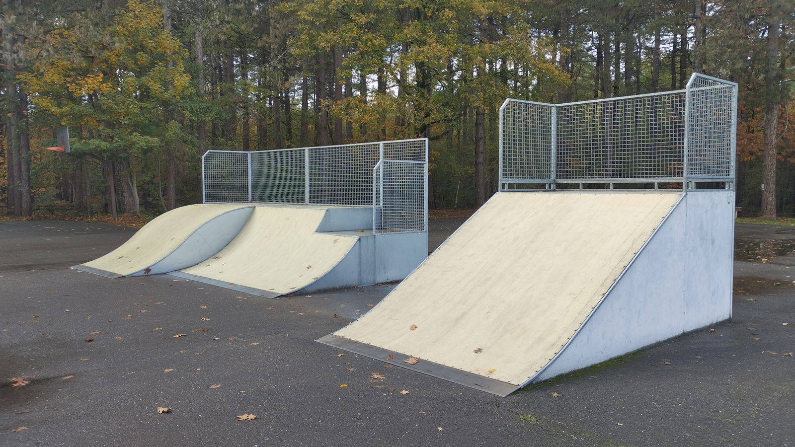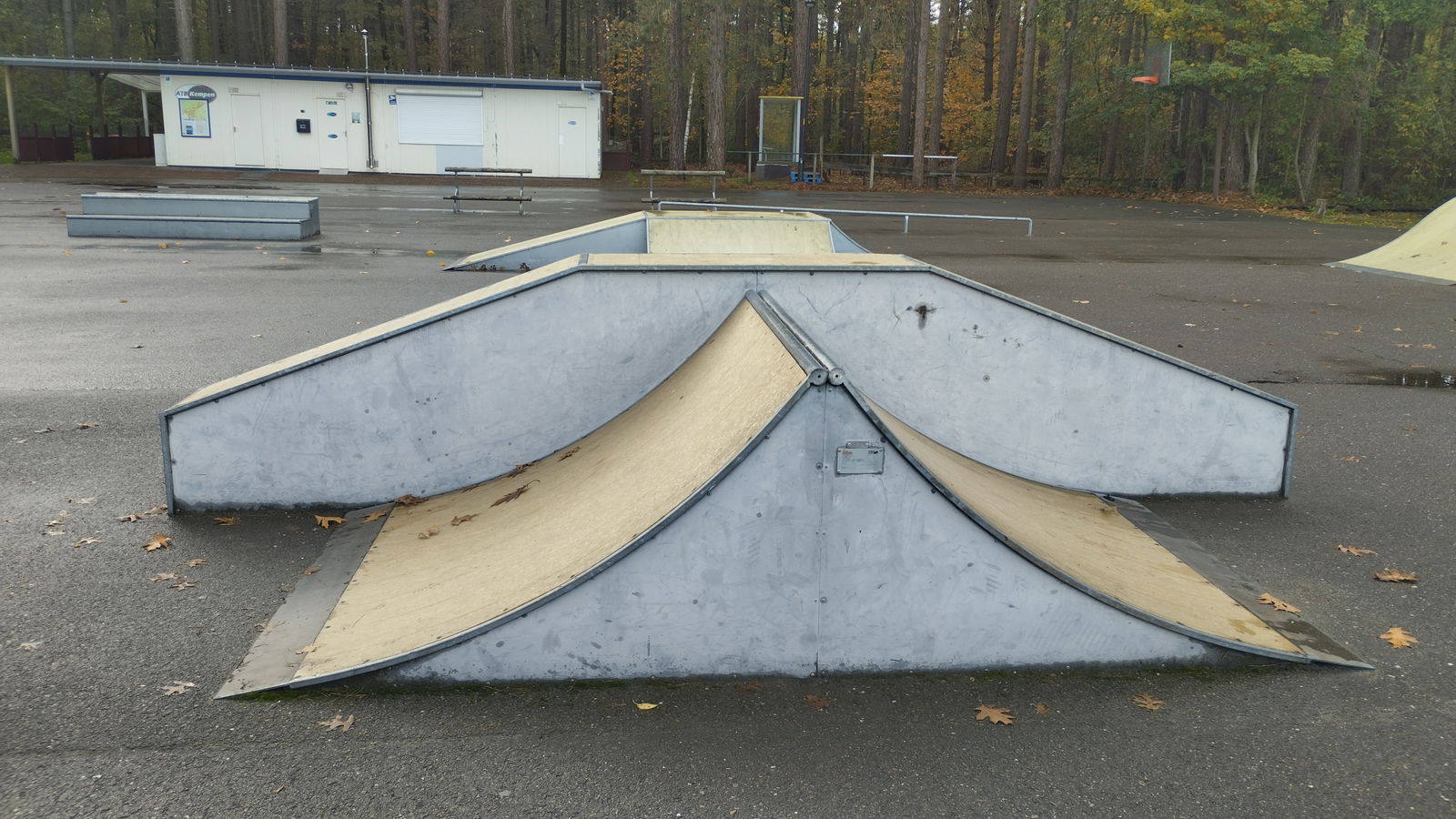 Ravels skatepark is made up of a back and forth run with a quarter pipe and bank on the sides of a funbox. The skatepark also features a miniramp.