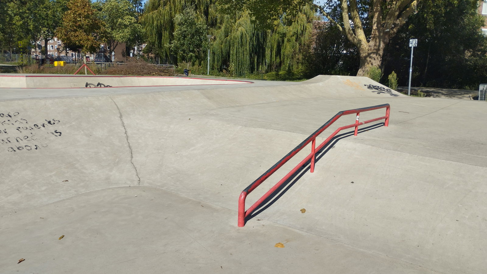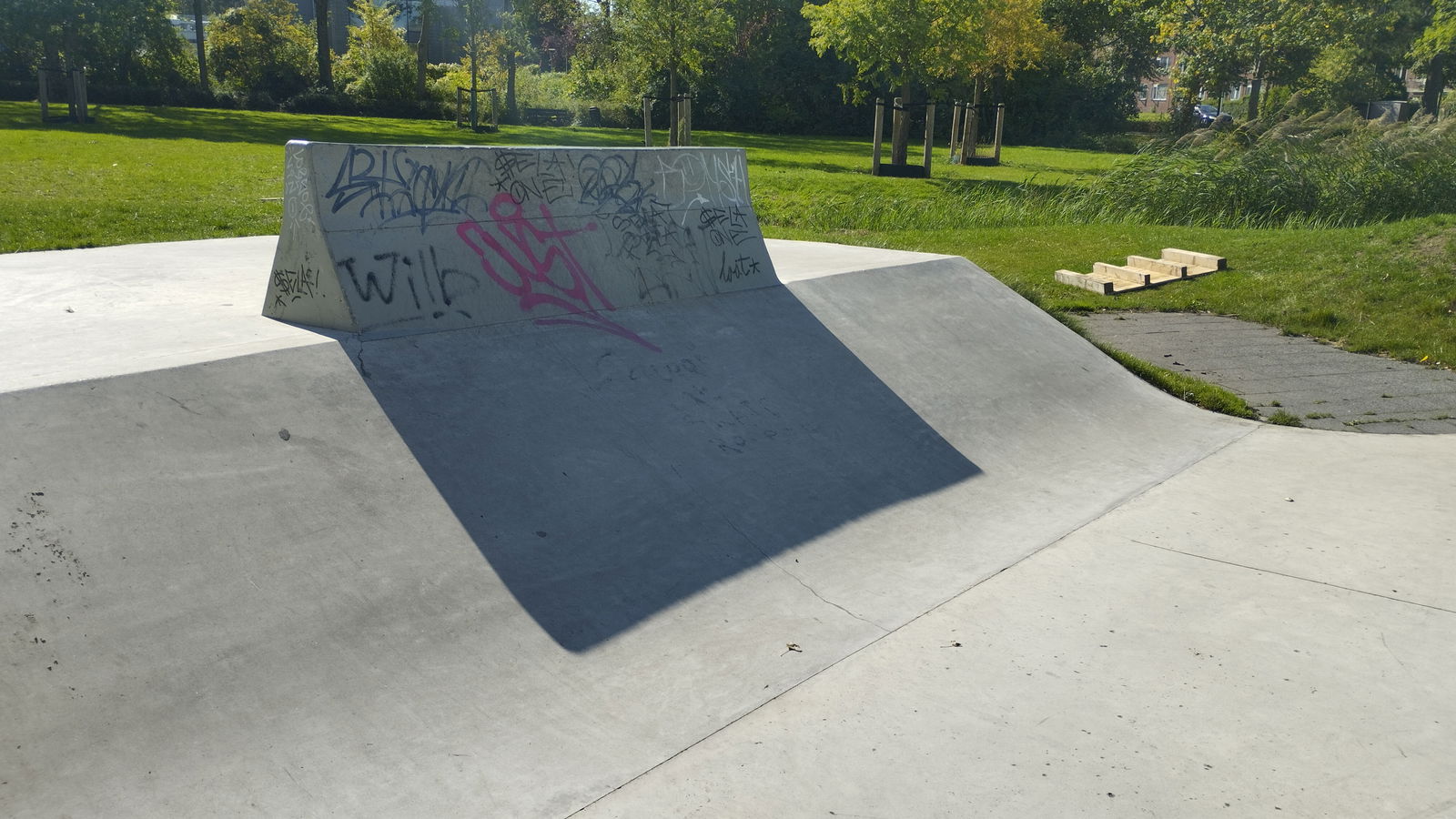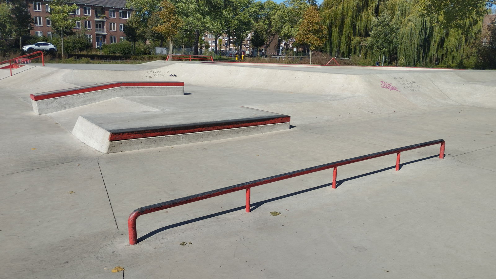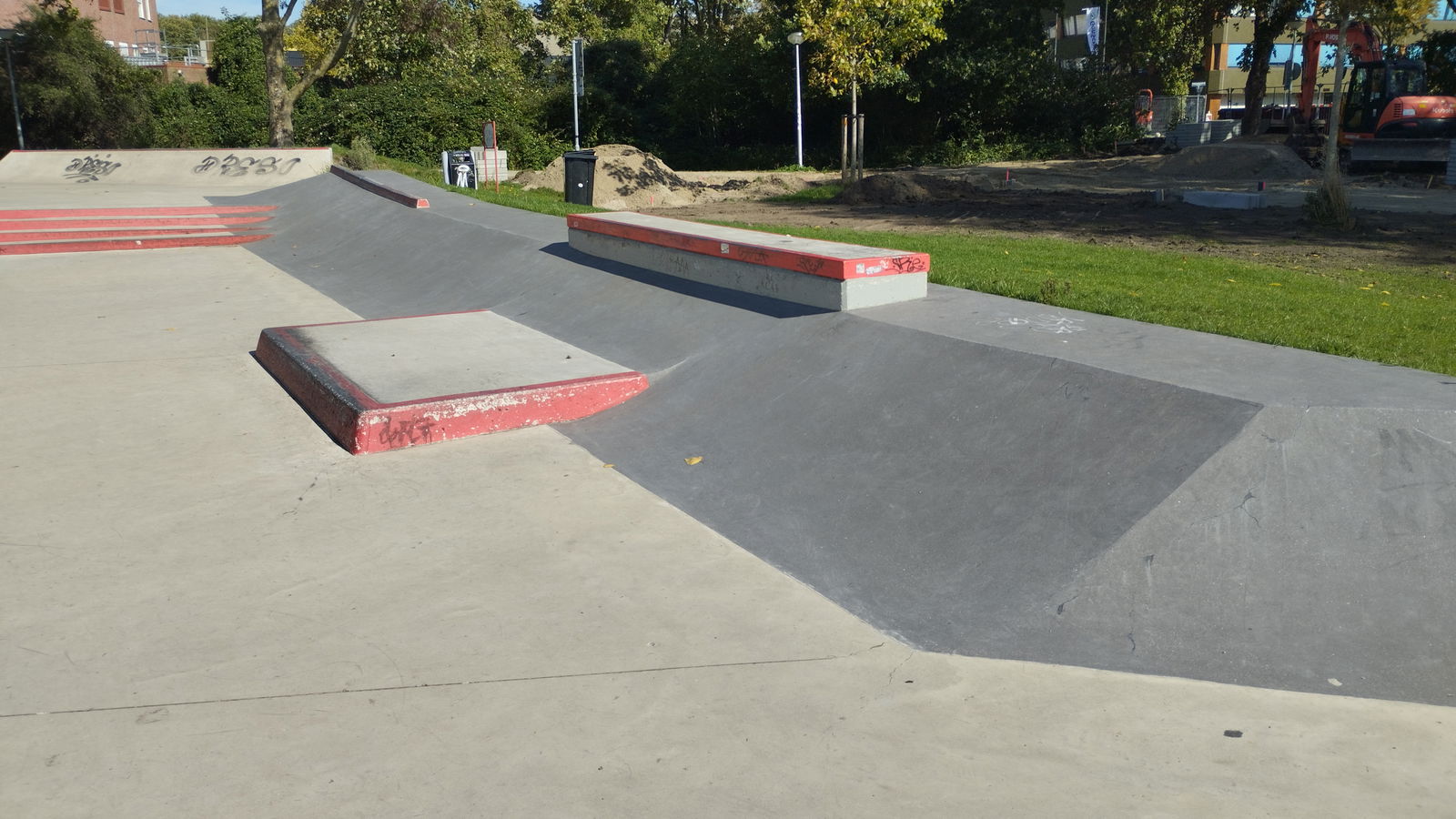 Rijswijk's skatepark, located at the intersection of Treubstraat and Sir Winston Churchillaan, is a medium-sized facility featuring a minipool and a diverse street course with various obstacles. The park includes several banked hips, a slappy curb, a manual pad with a bright red curb, and a Jersey barrier atop one of the banks. Despite the variety of elements, the park maintains a good flow.