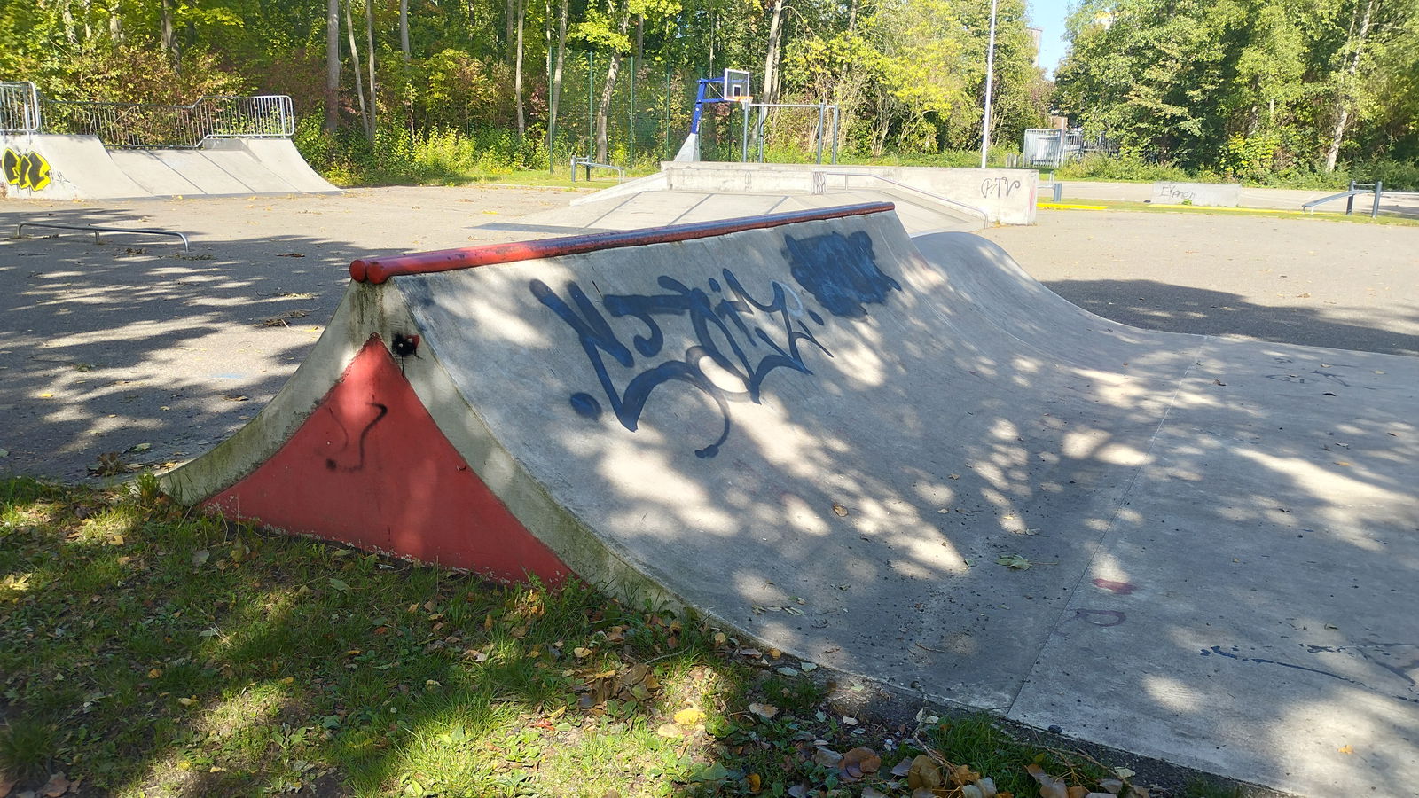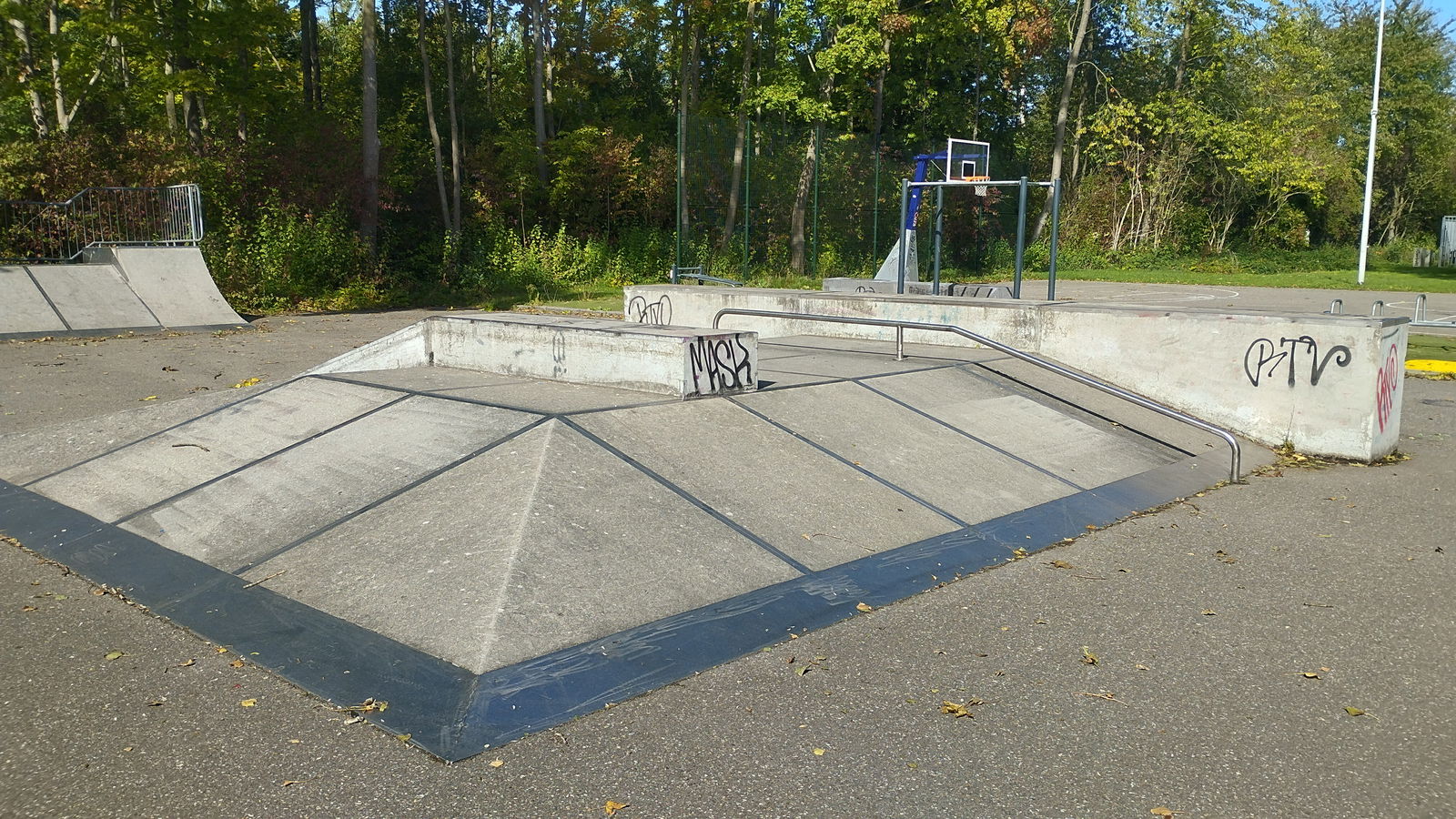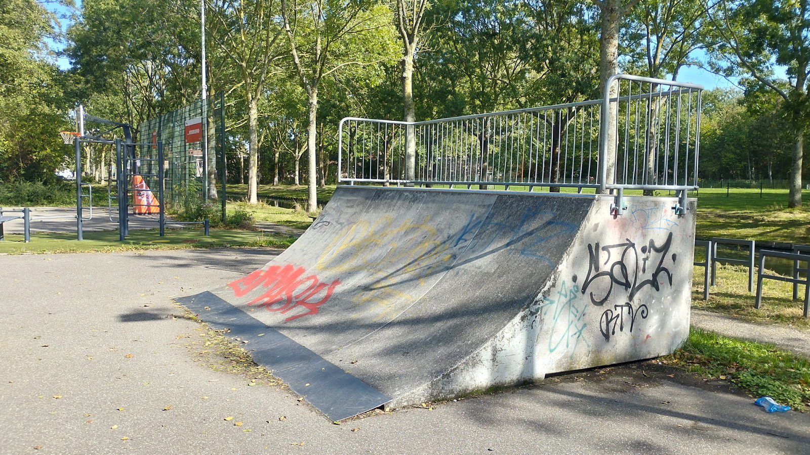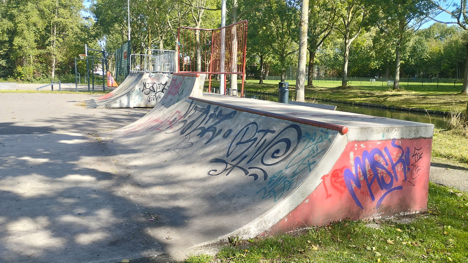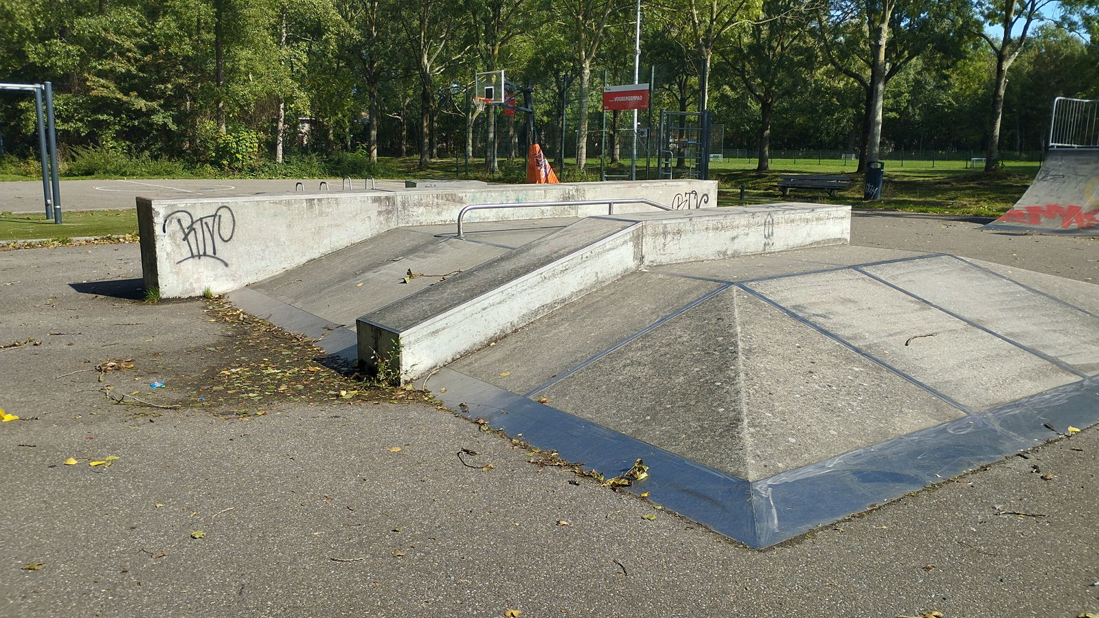 Rotterdam skatepark features a miniramp and several basic skateboarding obstacles in a back and forth setup.