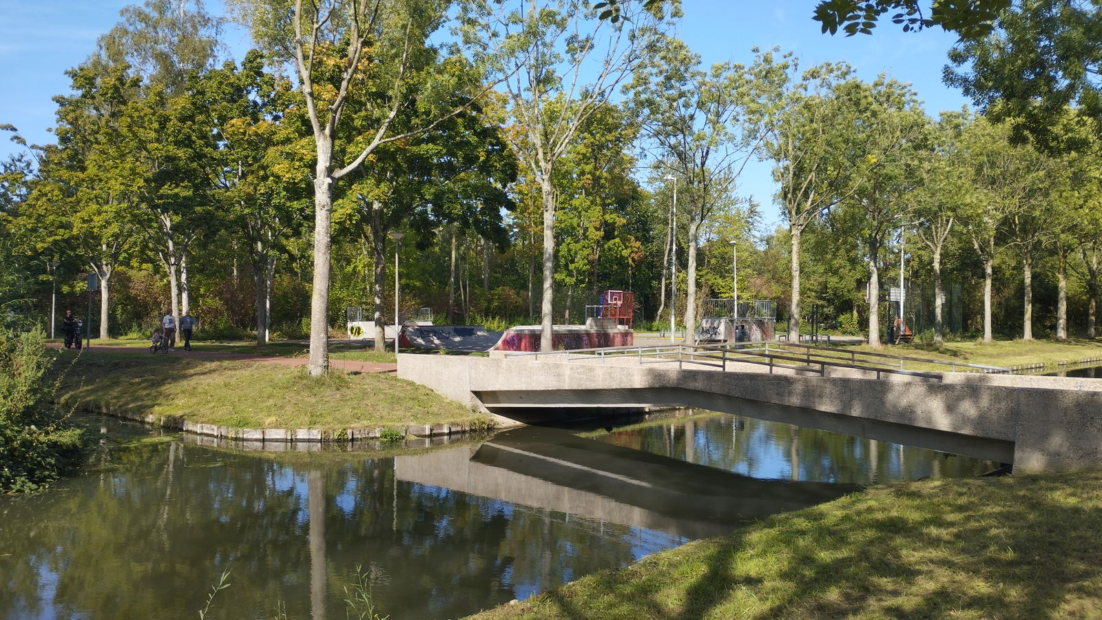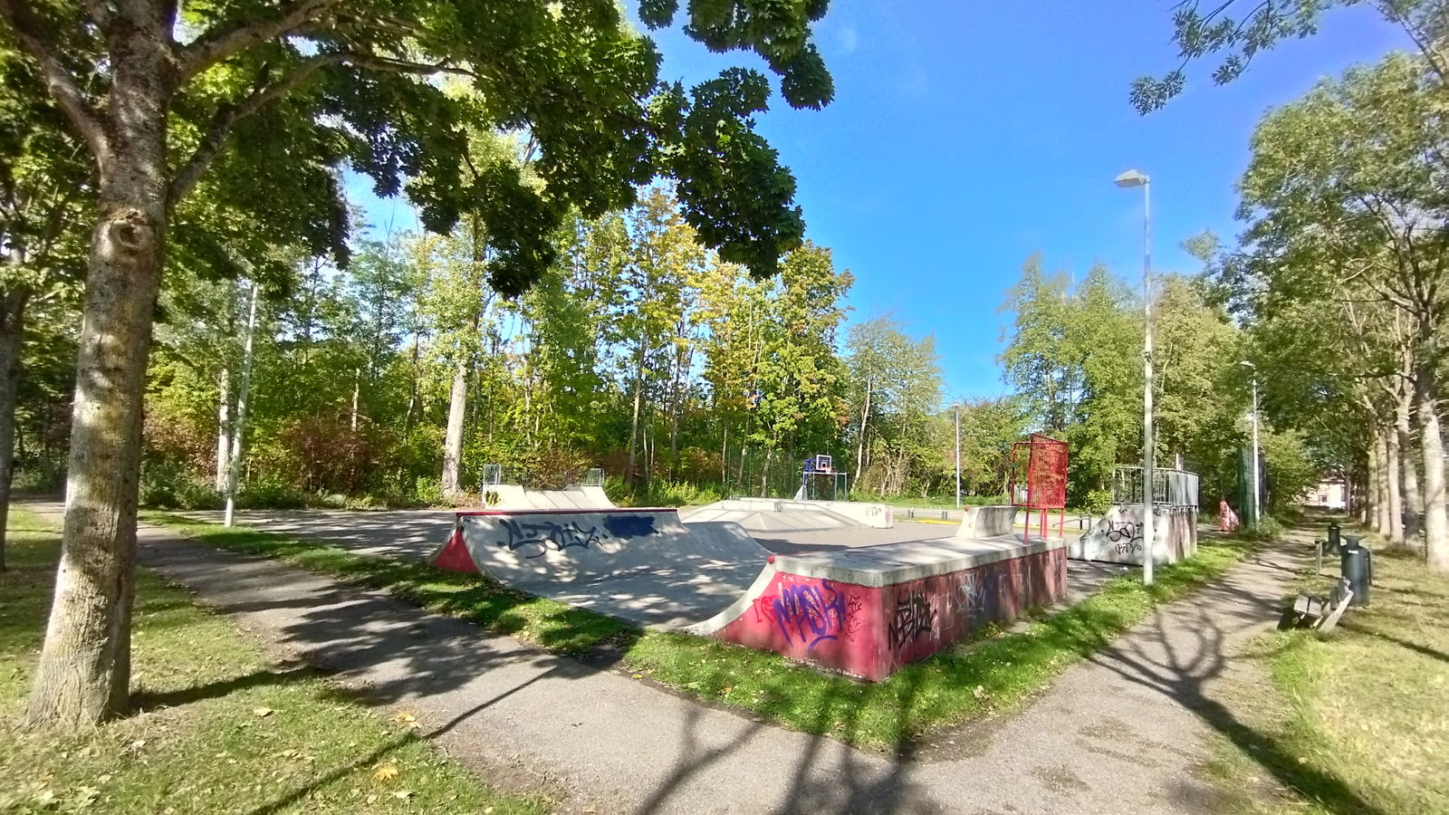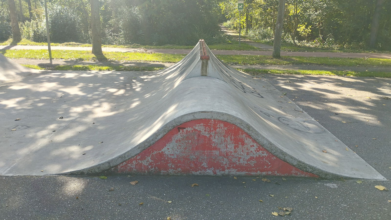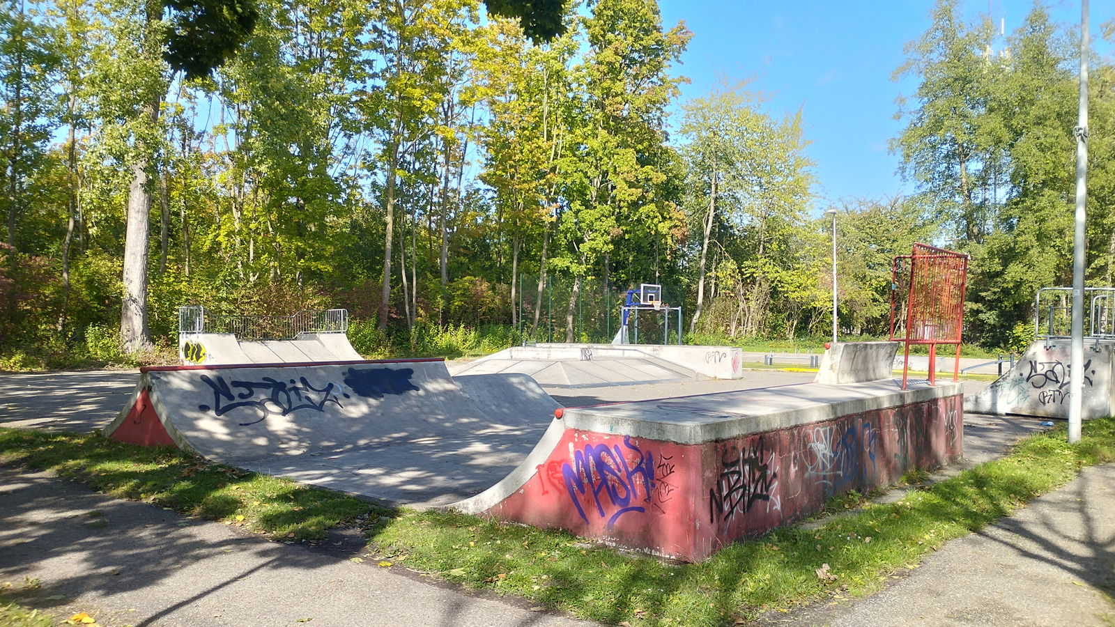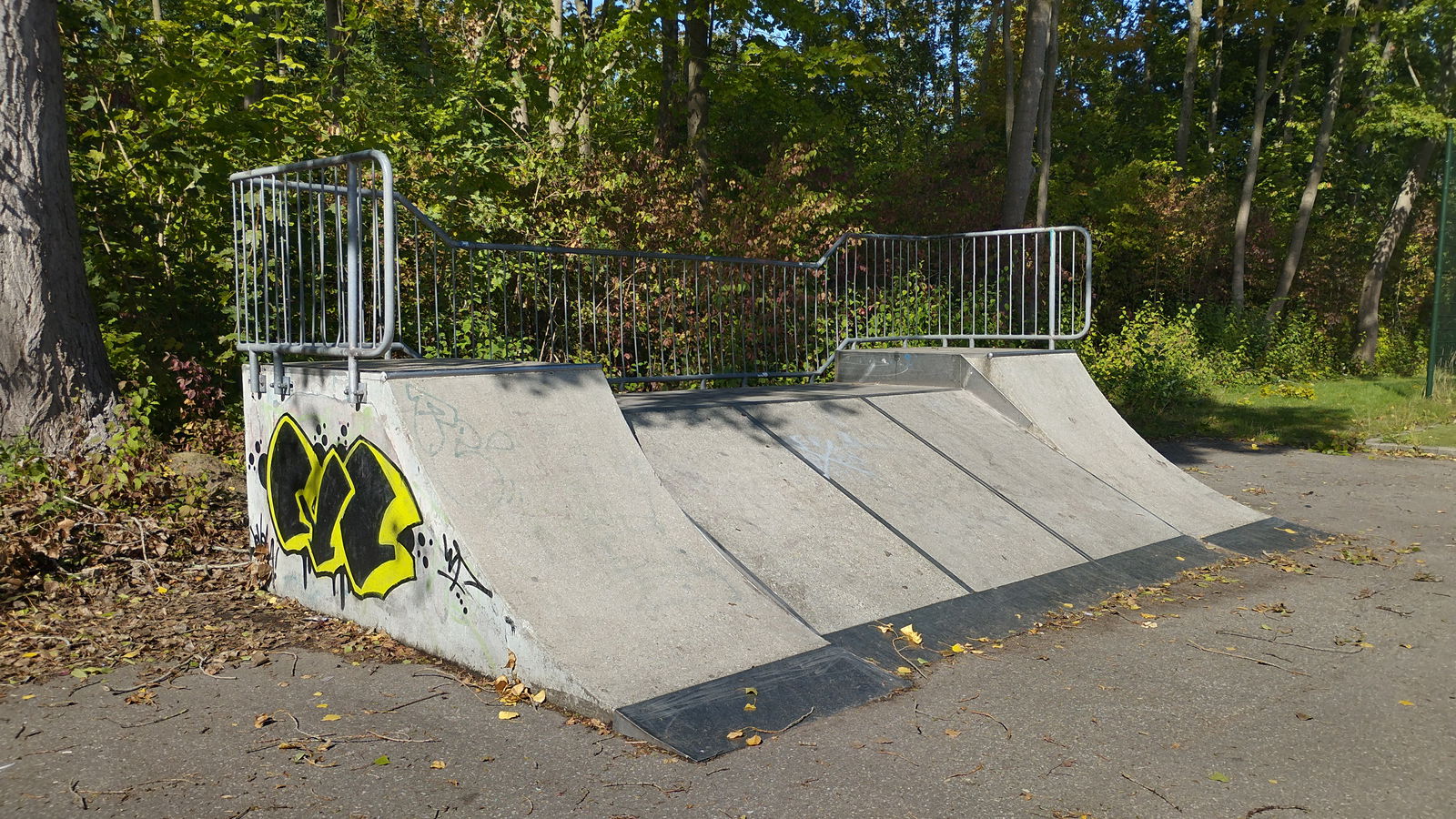 Rotterdam skatepark features a miniramp and several basic skateboarding obstacles in a back and forth setup.