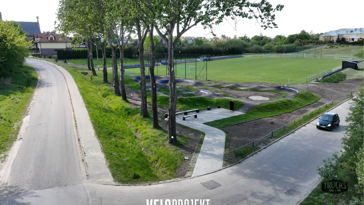 The Pumptrack in Rząśnik, located in the Masovian Voivodeship of Poland, is a modern cycling facility designed to cater to various wheeled sports, including bicycles, scooters, skateboards, and inline skates. This track provides a dynamic environment suitable for riders of all ages and skill levels. The pumptrack was designed and constructed by VeloProjekt, a company specializing in the development of cycling infrastructure. Situated adjacent to the sports field complex near the WKS Rząśnik stadium, the facility is conveniently accessible to the local community. The chosen site benefits from natural shading during the afternoon, providing a comfortable environment for users, especially during the summer months.
