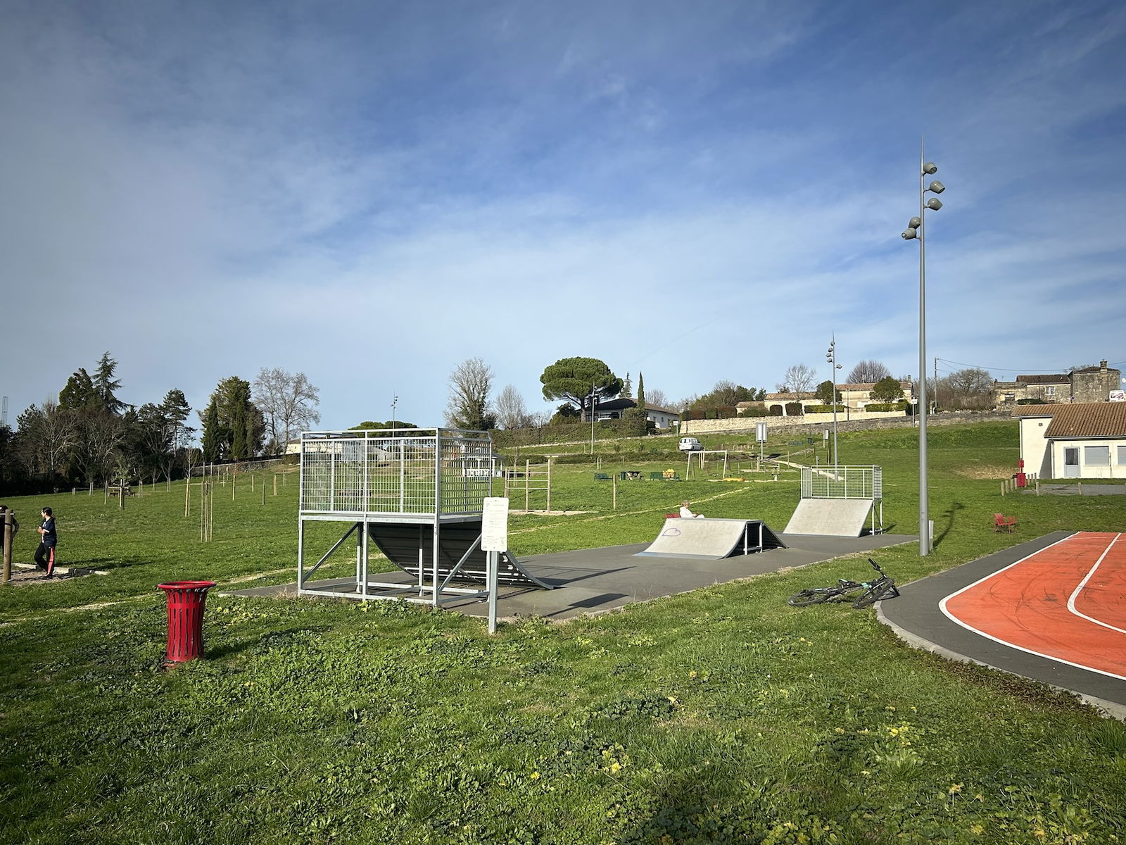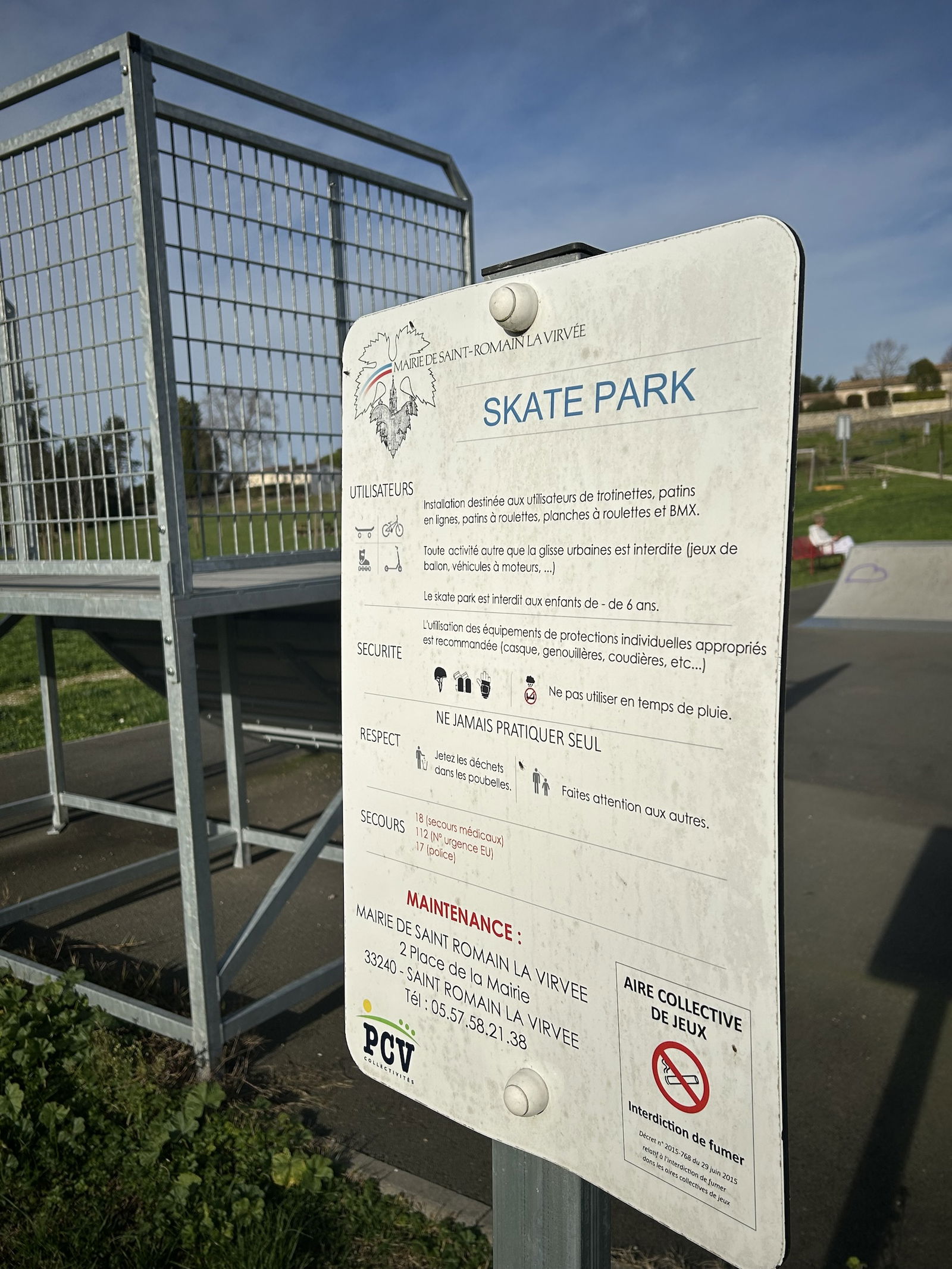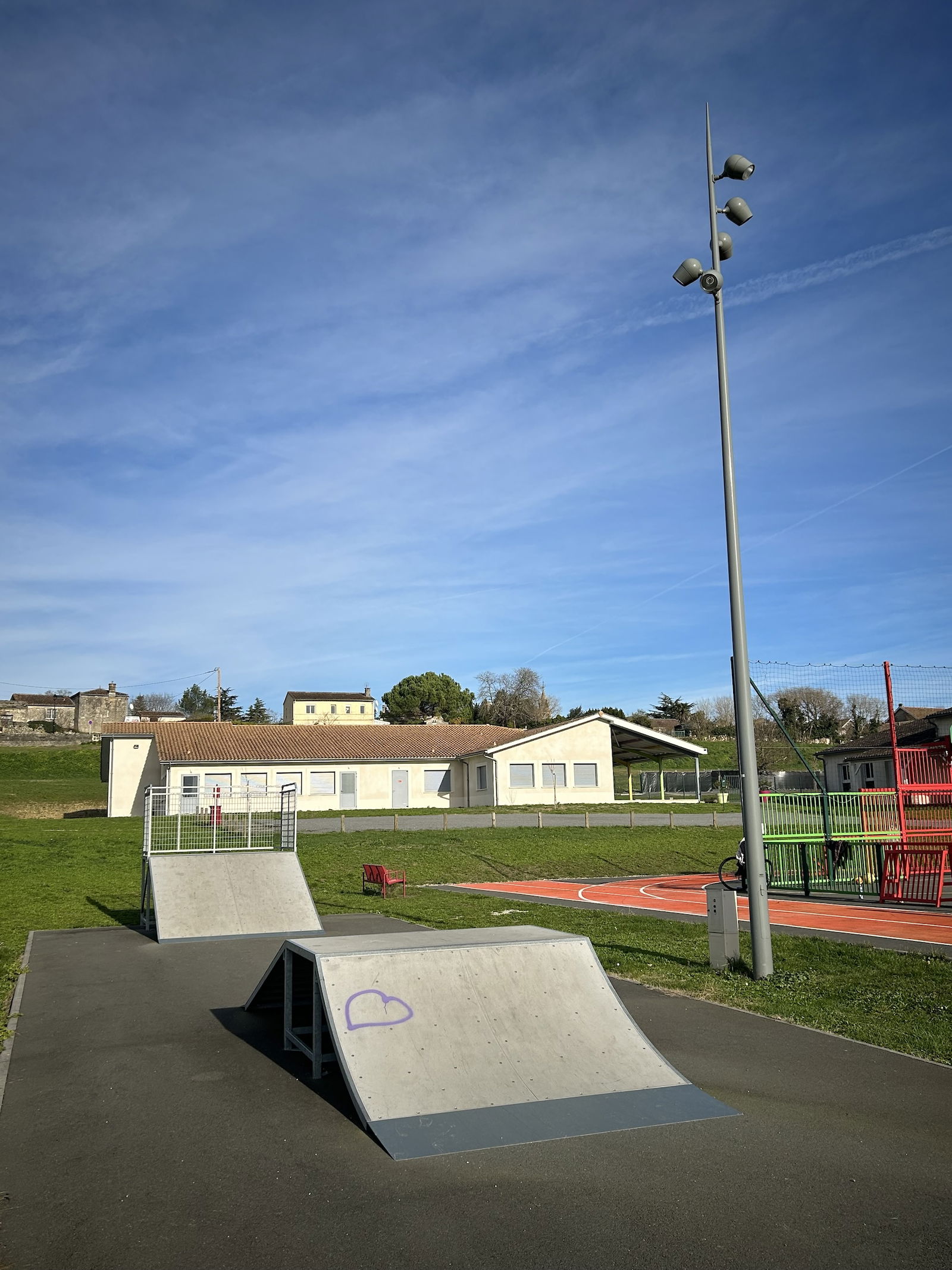 Saint-Romain-la-Virvée skatepark is a small park with several basic skateboarding obstacles in a back and forth setup.