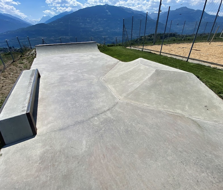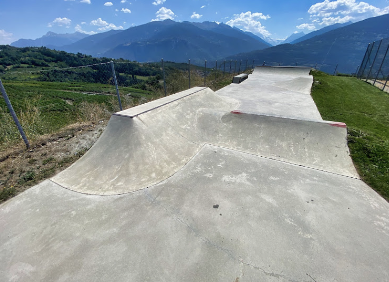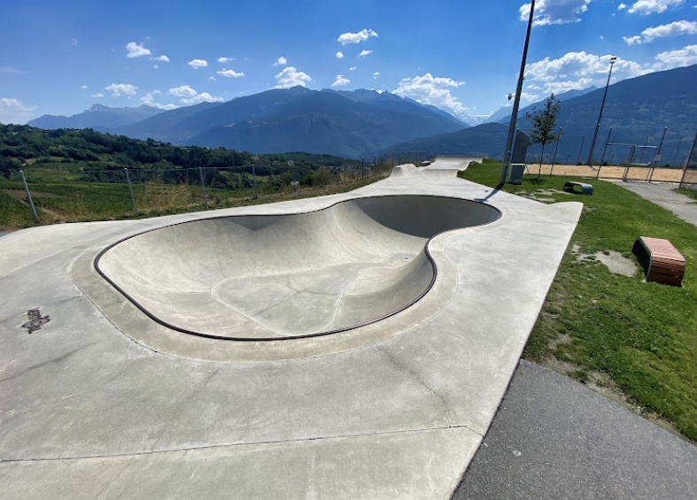 Savièse skatepark features a concrete bowl and several basic obstacles.