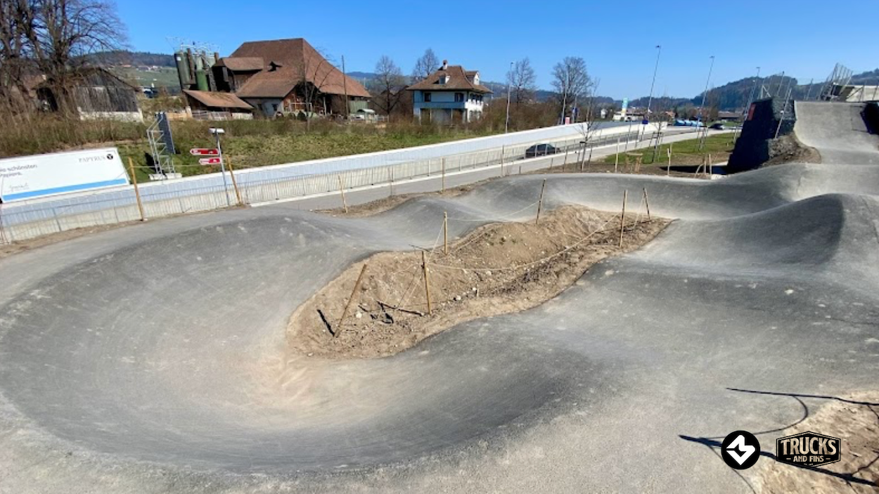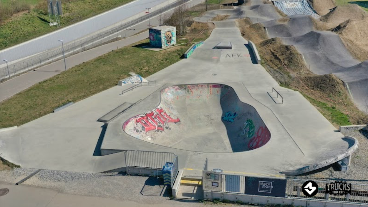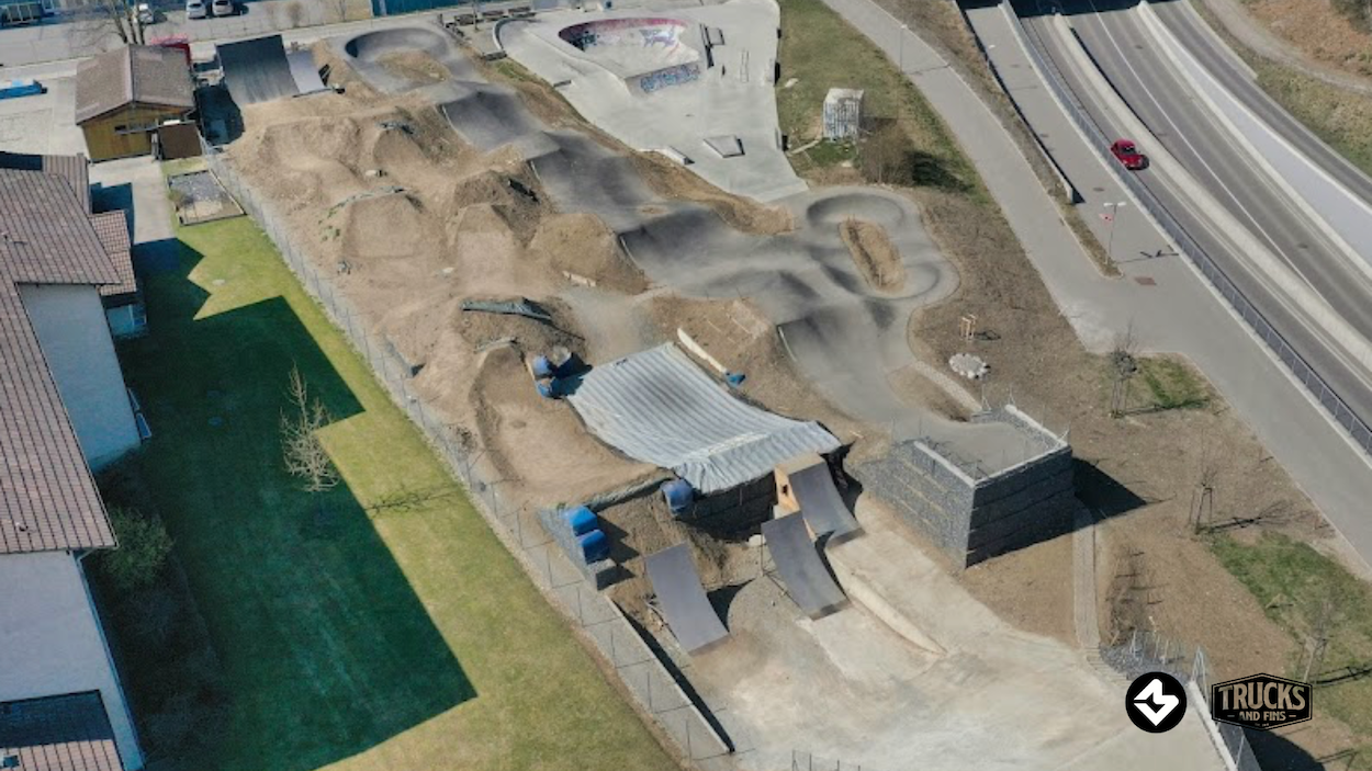 Established in 2021, this area provides a range of features for different skill levels. Adjacent to the skatepark, a mini pump track connects the two parks. An asphalt jump line with table jumps is ideal for beginners learning the basics of jumping. For more advanced riders, there are four medium-sized hip jumps arranged in sequence, an airbag with two different-sized ramps for practicing new tricks, and a dirt line starting with a dirt jump identical in size to the airbag jump, followed by four large hip jumps, a quarter to bank feature, and a smaller line returning to the start. The airbag is typically operated by local riders.