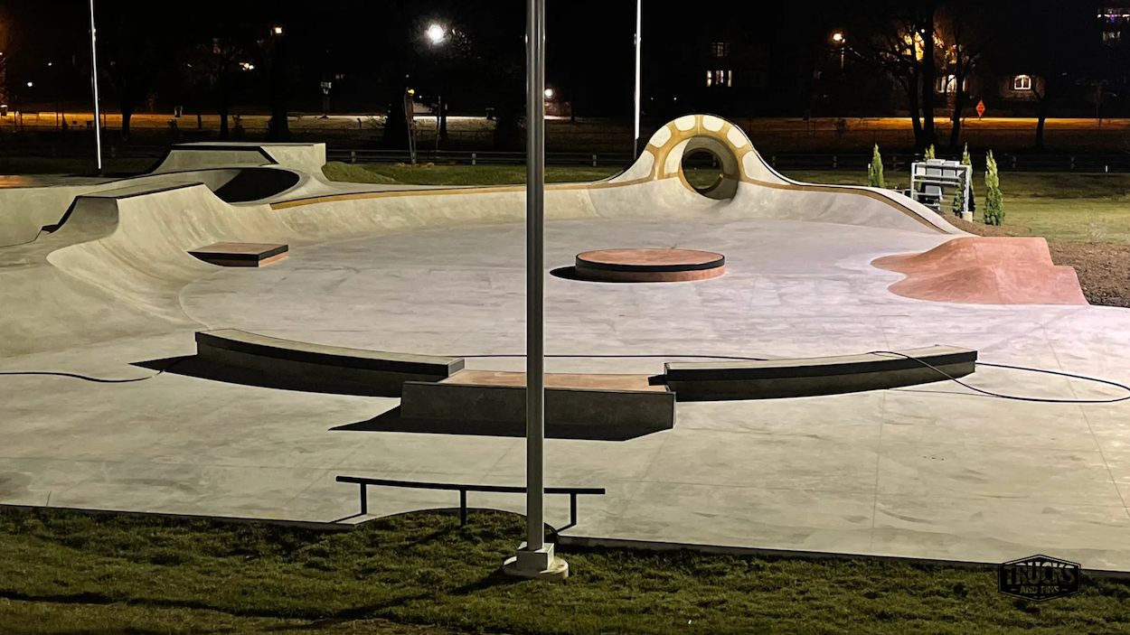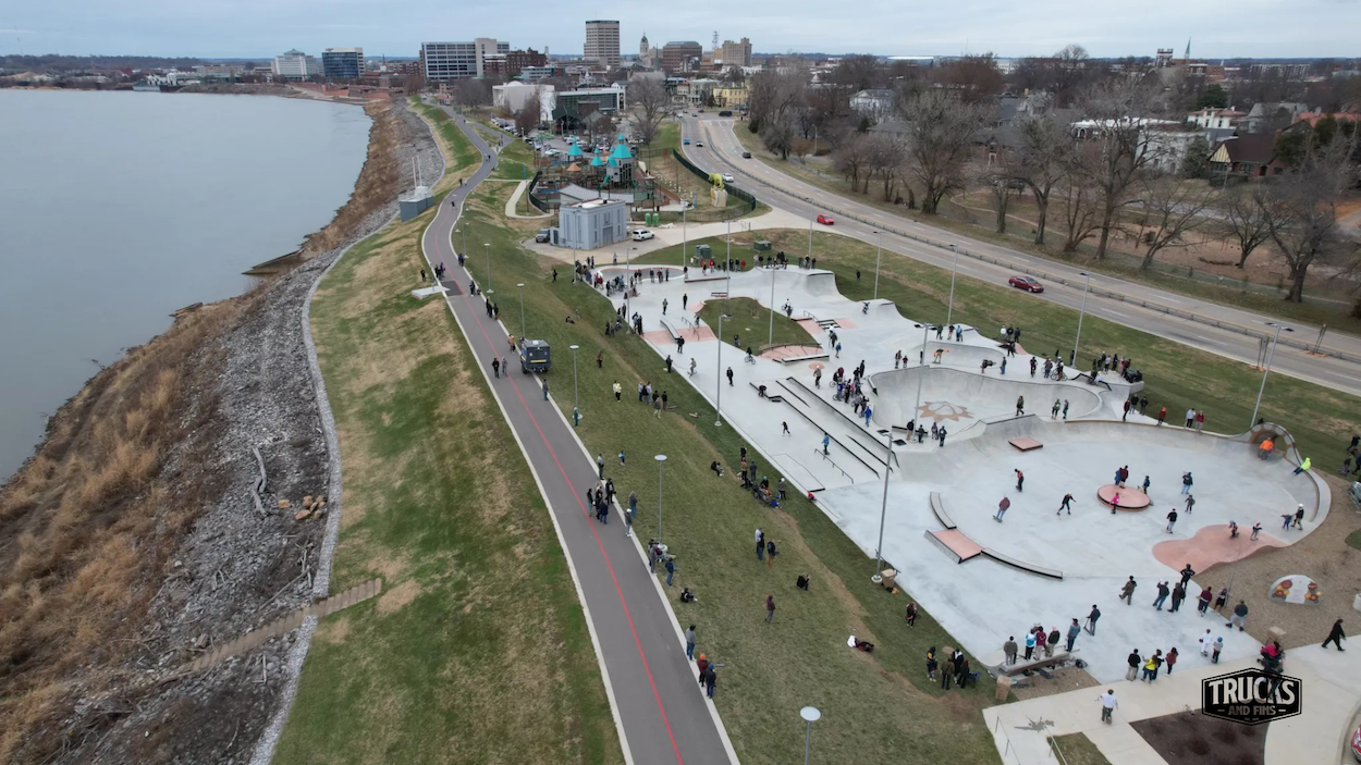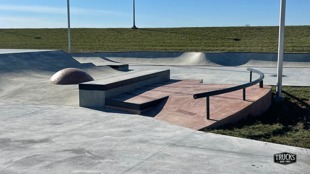 Located in Sunset Park along the scenic Ohio Riverfront, the park sits right off the levee walking path that links directly to downtown Evansville, making it as accessible as it is beautiful. Drawing from the natural beauty of the river and the area's rich history, the park’s aesthetic features sun and sunset motifs, with artistic nods to the nearby Angel Mounds site. The design was shaped by the voices of the local community — from skaters and BMX riders to roller derby crews — creating a space that’s built for everyone. The result is a true All Wheels Park that includes a hybrid roller rink/skatepark zone, a fast and flowing bowl, a deep pool bowl, long adaptive ledges, street-style terrain, and a separate multi-jump line crafted especially for bikes. Massive respect to the Evansville skate and bike community for pushing this vision forward, and big thanks to the city for backing such a bold and inclusive riverfront project. This one’s for everyone — and it rips. Hunger skateparks was responsible for the design and build in 2023.