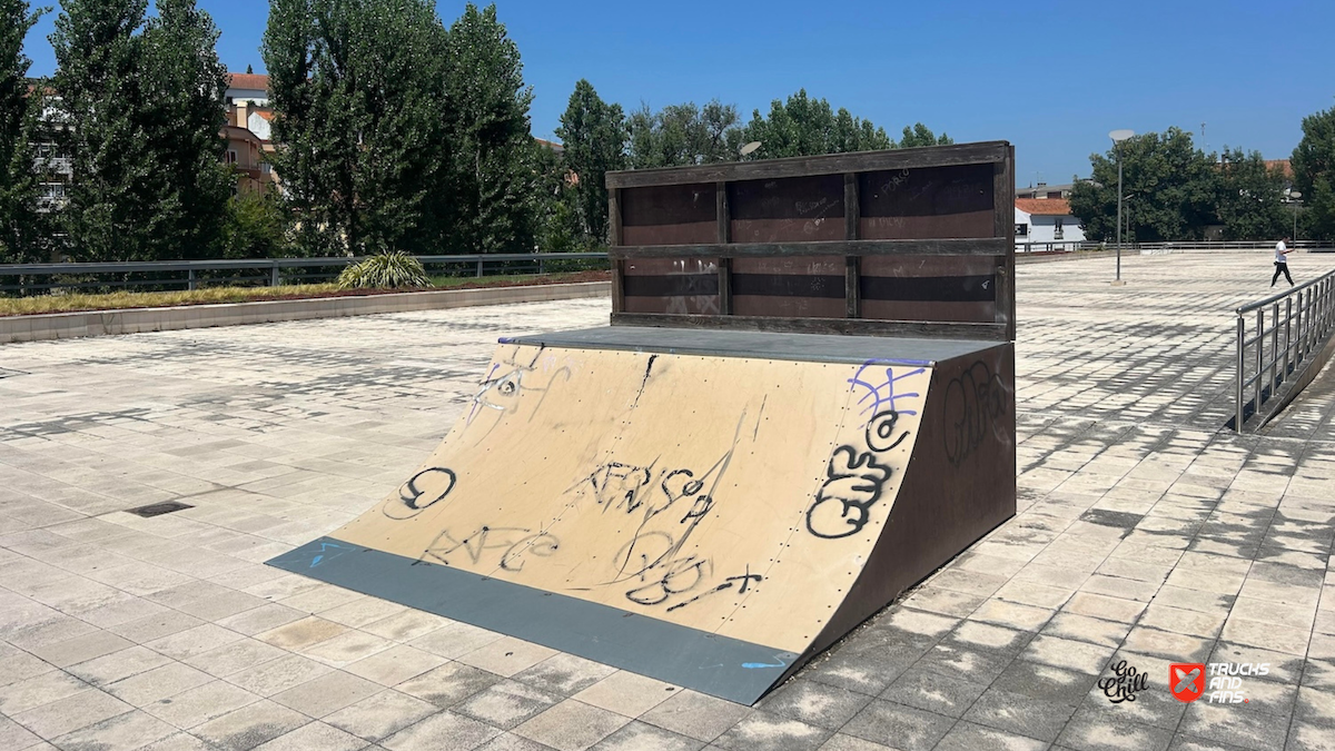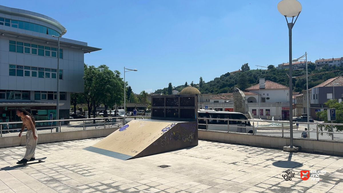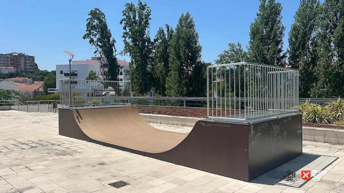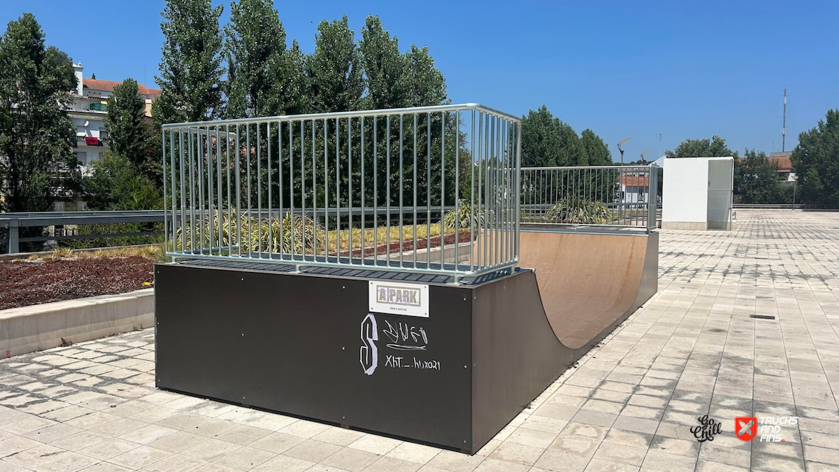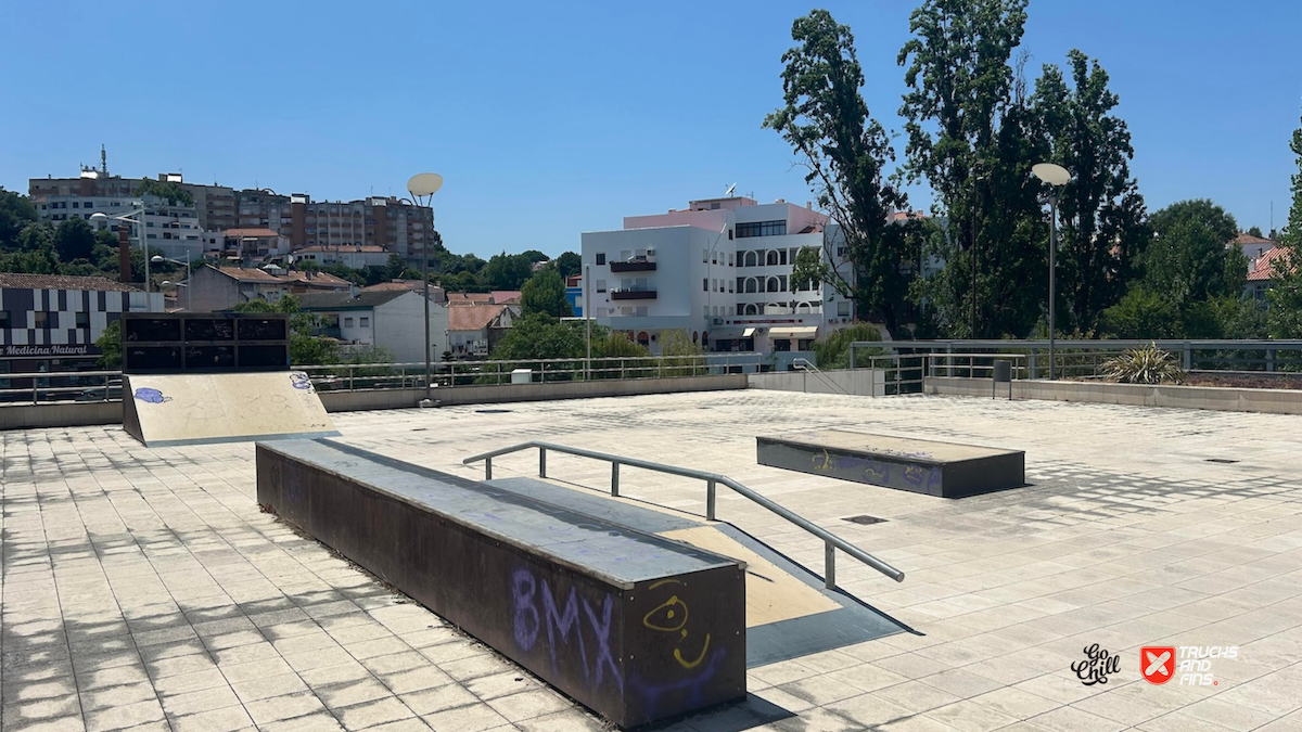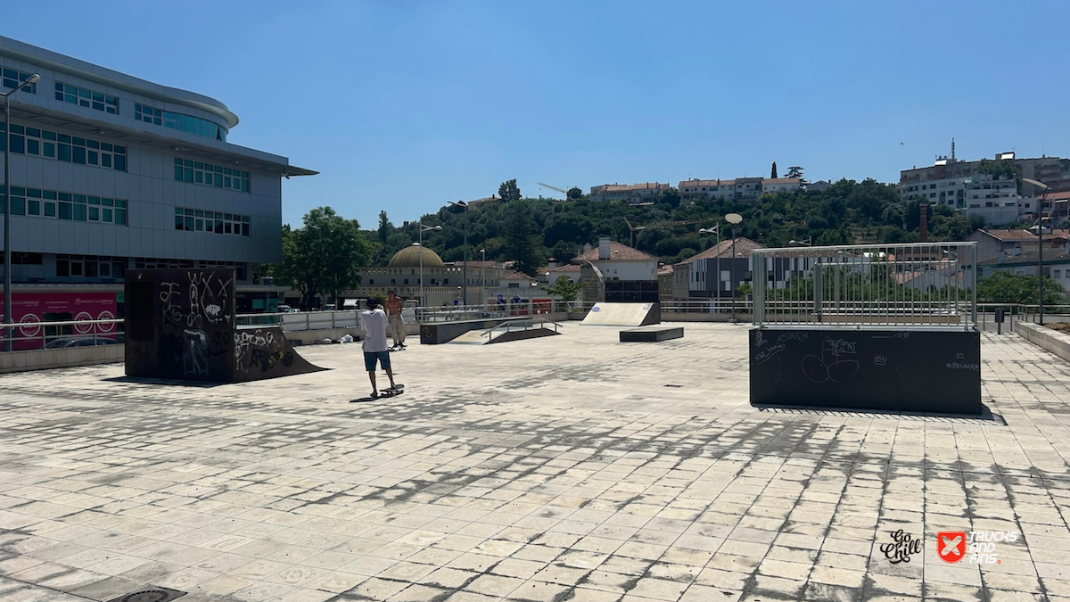 Torres Novas skatepark features a miniramp and several basic skateboarding obstacles in a back and forth setup.