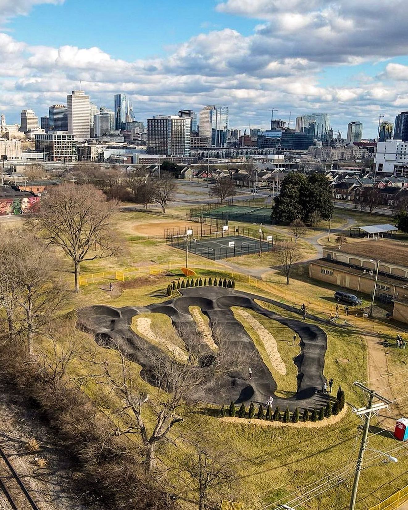 The Watkins Park Pumptrack, located in North Nashville, Tennessee, opened in 2021 and is the city’s first urban bike park. The pump track was a community-driven project, with key contributions from the Oasis Bike Workshop, SORBA Mid-TN, and funding from the Nashville Parks Foundation. The construction was handled by Pumptrax USA and Rock City Construction, transforming underutilized land in historic Watkins Park into a dynamic space for cyclists of all ages and skill levels.