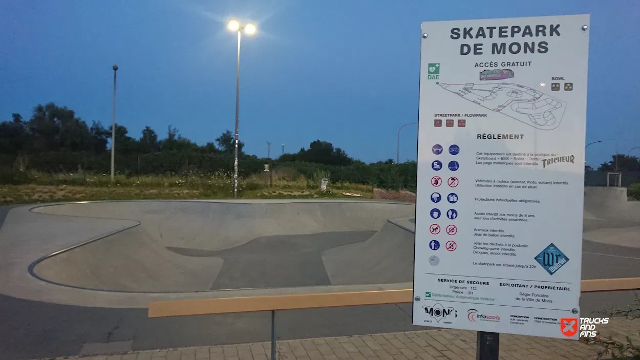 Du Grand Large skatepark is a concrete skatepark packed with street features and a fun mellow bowl. The skatepark is located next to the LAGO Mons Piscine du Grand Large swimming pool.