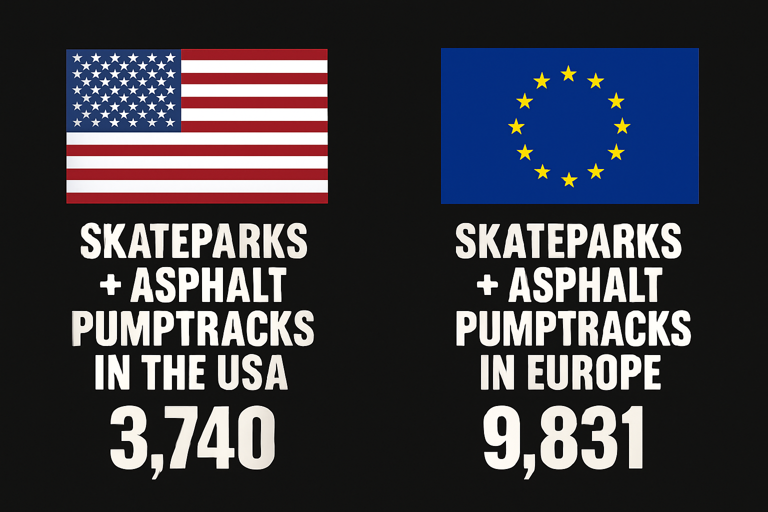 Yes, you read that right. Europe has over 2.5 times more skateparks and pump tracks than the United States. This includes everything from world-class concrete parks in places like Malmö (Sweden) or Barcelona (Spain) to modern asphalt pump tracks popping up across Germany, France, and Eastern Europe.
